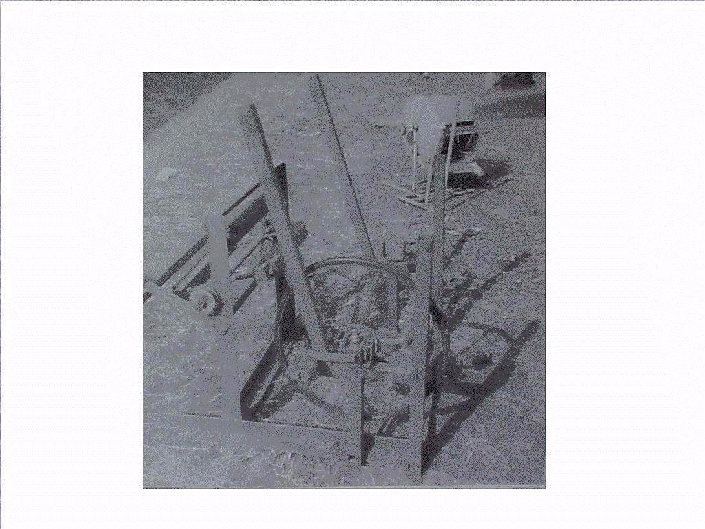 EARLY DESIGNS - A 2 MAN PEDAL THRESHER, BELT DRIVEN, WITH WOODEN BEARINGS. THE ORIGINAL DESIGN IS IN THE BACKGROUND - IT WAS COUPLED TO A ONE-MAN PEDAL UNIT WHOSE FRAME WAS LARGELY MADE FROM STEEL WATER PIPE (NOT SHOWN HERE)