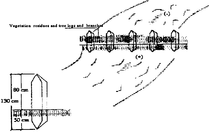 Toroba are homemade diversion structures built of wooden poles, taken from trees such as the curari and cuji in Venezuela, vegetation residues, and logs. The wooden poles are 50 and 130 cm in length and are placed at intervals of 50 cm to 70 cm to define a wall of debris that will divert the runoff. This technique may also increase infiltration to the groundwater.