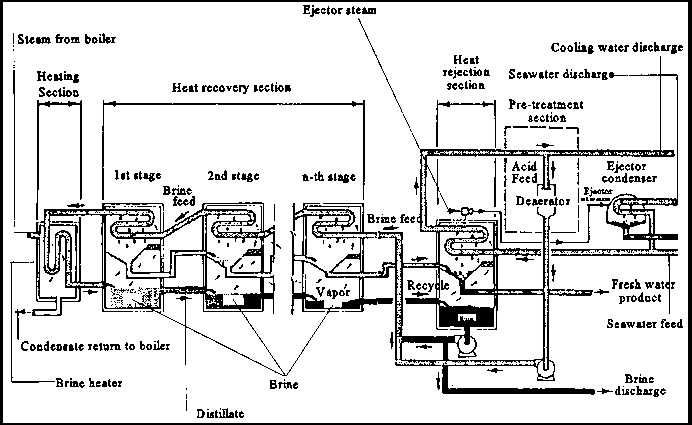 The freshwater is formed by condensation of the water vapor, which is collected at each stage and passed on from stage to stage in parallel with the brine. At each stage, the product water is also flash-boiled so that it can be cooled and the surplus heat recovered for preheating the feedwater.