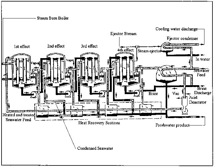 Research into the falling (or spray) film MED thermal desalination process suggests that further development of distillation technologies can produce product waters that are comparable in quality to those produced with current MSF technologies and also offer additional advantages, including lower pumping requirements, higher heat transfer rates, and greatly reduced pressure differentials across the heat transfer surfaces. These favorable comparisons also apply to a falling (or spray) film VC design. Some additional considerations include: