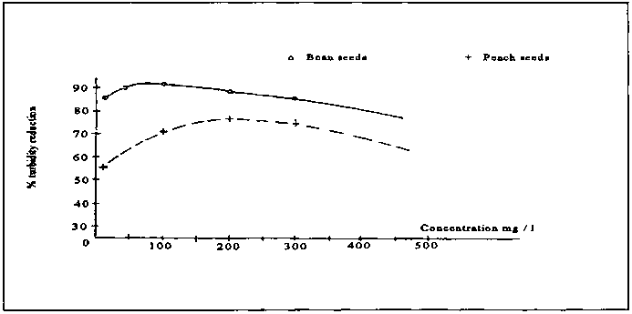 In using ground seeds for water clarification, the size of the particles is an important factor: generally speaking, the smaller the particles, the more efficient the clarification process. This is particularly important in the removal of color using peach and bean seeds (Figure 20). The concentration of the resulting coagulant solution has also an effect on the reduction of turbidity in the product water (Figure 21). For most plant seeds, the lower the pH of the water, the more effective the treatment. Suspended materials coagulate better at lower pH values. Peach seeds are an exception to this rule of thumb. Moringa oleifera was found to be more efficient at reducing turbidity than aluminum sulfate (alum). In general, also, the higher the initial turbidity, the higher the removal rate.