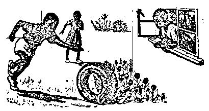 "Yes, we can." Timve rolled the tyre across the garden. He ran after it and hit it with his hand. The tyre rolled faster. He hit it again.