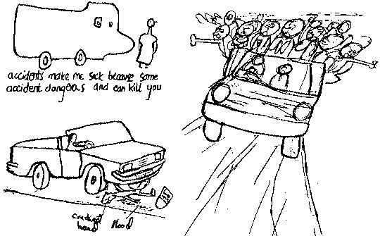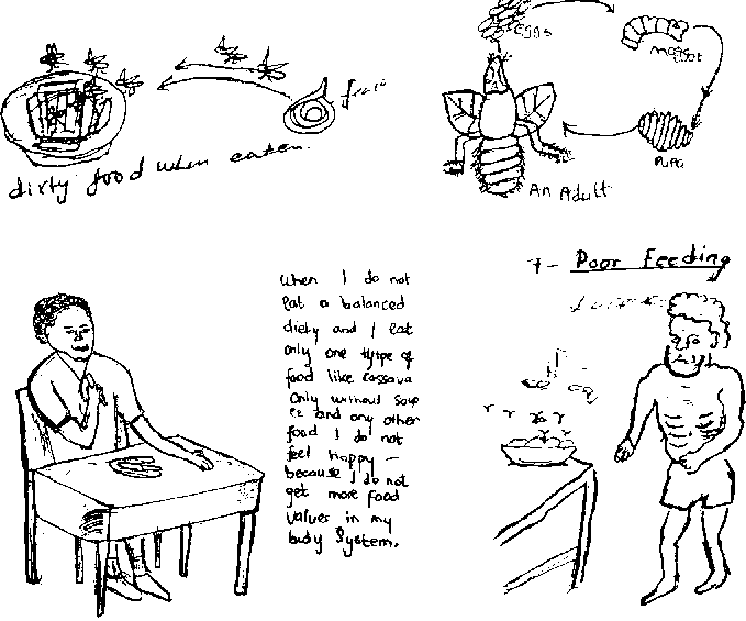 From the draw and write data, it would seem that children from Primary 6 upwards already have quite detailed knowledge about AIDS and how to protect themselves from it. Several describe different situations in which they might find themselves faced with saying "no" to sex, and appear to have given some thought to their responses. They want to know more and a number of them spontaneously volunteer teachers as a source of information. They also respond to the drama events concerned with AIDS.