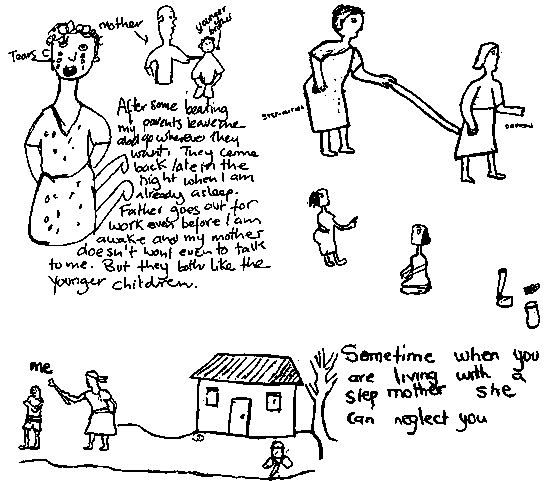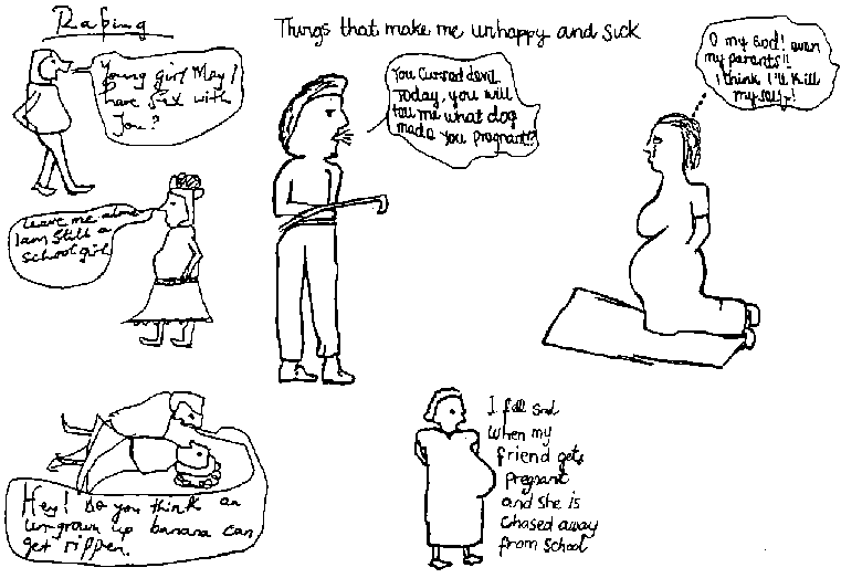 ...I feel unhappy when a boy runs after me really also me feel sick because this time is an aids era when you see like boy wanting to make love to you, you know he wants you to die which I dislike so much. On addition to that it is so amusing to that a boy can make a girl pregnant and afterwards denies the pregnancy. (Girl 19yrs)Being raped by adult people who some times have got aids... some parents don't give their children things they need when sometimes their useful so children end up looking for people who will provide then money where by they get pregnancy because you cant take peoples money for nothing who is not our mother or father. You can imagine nowadays thing changed even cousins don't respect each other (girl 15yrs)