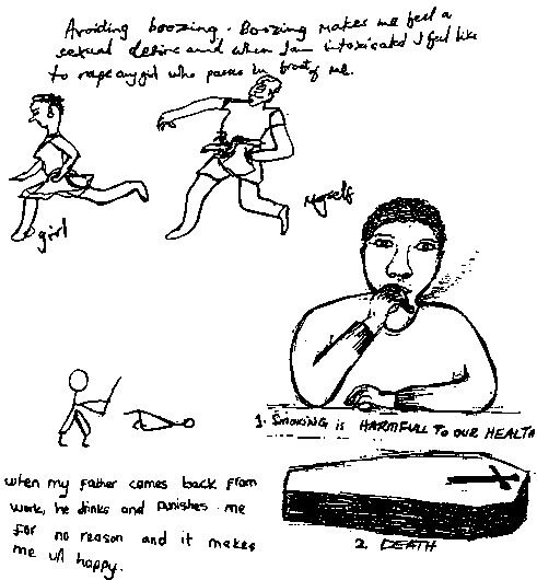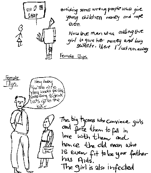 It is interesting to note the that girls' feelings of vulnerability to the threat of pregnancy is frequently linked to a fear of becoming infected with HIV/AIDS. The threat of rape, persuasion tactics of young men, material "bait" offered by adult men (a couple specifically mention teachers getting sexually involved with pupils) are some of the concerns expressed in the images and comments.