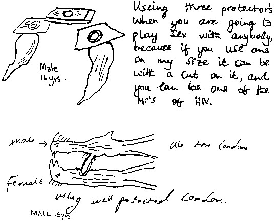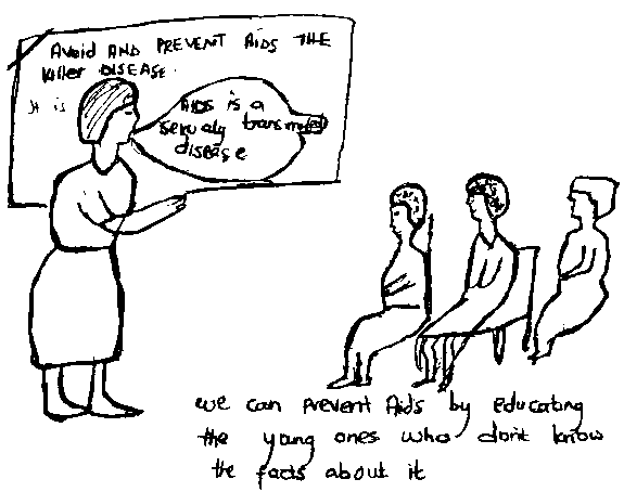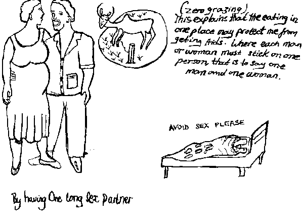 Children from all schools volunteer the idea that you can protect yourself from AIDS through learning more about it from school and images of AIDS education in a formal classroom setting are common. However, there are also very many references to mass media AIDS slogans - such as "zero grazing" and "love carefully", and it is impossible in this study to be able to assess what the children have picked up from the media, what they have picked up from friends and through hearsay, and what they have learnt at school.
