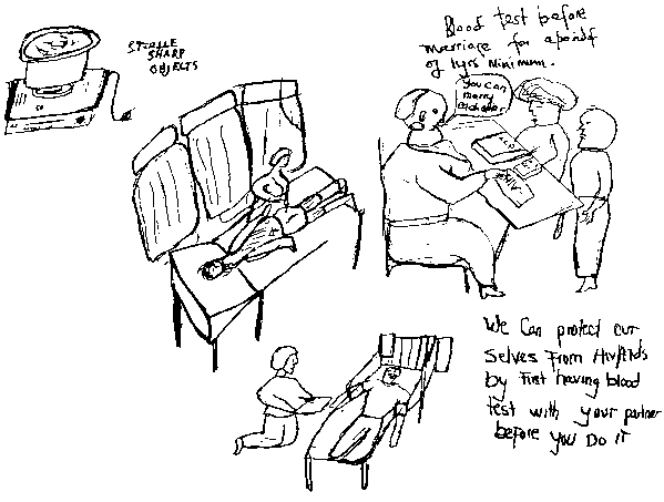 56% of the sample include one or more ideas related to the use of sterile instruments in hospital - ensuring that new needles are used, that instruments are properly sterilised, or that you take your own needles to hospital. The girls mentioned these ideas more than the boys and they were also mentioned more frequently by primary school children than secondary school children.