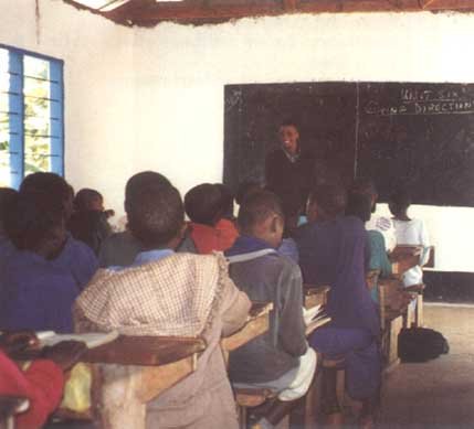 Ultimately all the pupils did repeat the sentences correctly. It was unclear, however, whether they had learned the meaning of the sentence, or whether their skill lay in expert mimicry. In a Standard V English lesson observed (Photo 5), pupils obviously had a greater understanding of what they were reading, although in a class of 65 there was one book for every seven or eight pupils. As the pupils were sitting in rows, half of each group were effectively reading the book upside down, but still managing to repeat in unison the short sentences read aloud by the teacher. One ramification of this strategy of chanting, along with the frequent use of singing, is the sheer noise emanating from each classroom. Since the roofspace between each classroom is not sealed, it is sometimes almost impossible to hear the teacher talking if the pupils in the adjoining room are singing or chanting.