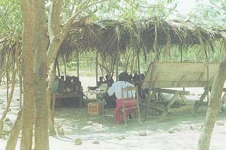 "Teachers, headteachers and community members are unanimous in their placing buildings, furniture, toilets and other infrastructure issues as the top priority. To state that the infrastructure of schooling is in desperate need is to understate the problem. Half of the schools visited, not only has an inadequate building they had no building whatsoever. In the "Photo Essay" accompanying this report, we have shown mud, tin, grass, fern, tree, and thatched schools, in addition to more conventional block, wood and brick buildings. Furniture was all but non-existent in many rural schools, and if the children wanted to sit on other than rock, they had to bring their own furniture from home. We observed hundreds of children, many of whom had no breakfast, go six hours without a drop of water and nothing to eat. The bushes and trees surrounding many "schools" were a significantly cleaner environment than the disastrous toilets and urinals we photographed. Only in the best private school visited, was there any evidence of meaningful physical activities, sports, playgrounds, music or art. With the exception of a large dirt or grass area, occasionally with a goal or basket, most rural schools have no recreational facilities. Other than the strangely out of place "western " drum, schools were devoid of musical instruments. In the heat of the midday, children started to sleep and lose interest, to the extent that many headteachers just closed school at noon. Some thirty years ago, psychologist Abraham Maslow wrote of the hierarchy of needs, suggesting that until our basic needs, such as food, water and shelter, are met, we have a difficult time concentrating on higher needs. We unanimously concur that it is all but impossible for a hungry, thirsty, tired, hot, ill child to learn. When teachers lack even a chair or table, to say nothing of such "luxuries" as a book shelf or locked cabinet, it is safe to say that the teacher's basic needs have not yet been met, and until they are, it is unlikely that they will have the time or energy to become like the minority of creative, talented teachers who grace so many school settings in Ghana. These outstanding teachers somehow overcome extreme deprivation, but the less superhuman, need their basic needs met if they are to succeed".