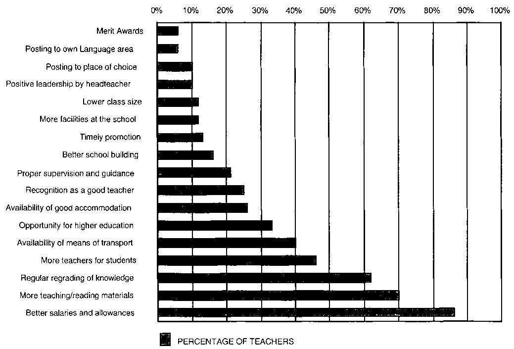 In the teacher motivation study (GES/UNICEF op. cit.) and Kraft, R. (op. cit.) study referred to earlier, 'recognition as a good teacher' and 'better teaching/teachers' were accorded 25% and 11% respectively as priorities for motivating teachers or improving school quality.