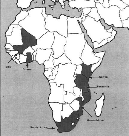 Map of Africa showing country locations of case studies