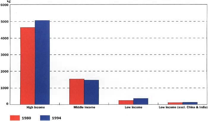 Commercial energy use refers to the use of oil, natural gas and solid fuels, but excludes the use of firewood and charcoal.FIGURE 12 - Commercial Energy Use, by Income Group of Country, 1994Source: World Development Indicators 1997.