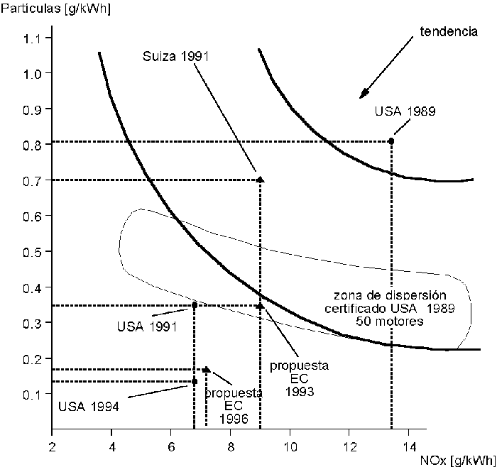 Un ejemplo de la tendencia general que se observa en los países industrializados sobre la fijación de valores límite es el que aparece en la figura 2 en relación al tráfico de vehículos con motor diesel. Las reducciones que exigen algunos países -especialmente Estados Unidos- en cuanto a las emisiones de partículas de hollín y óxidos de nitrógeno [10] son considerables.