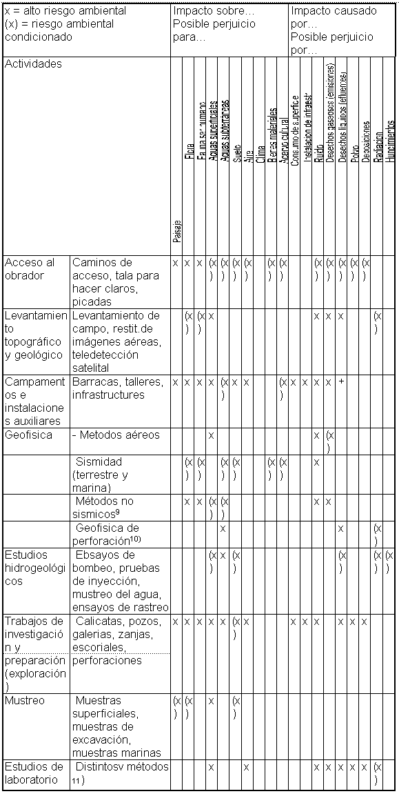 Los riesgos a que está expuesto el medio ambiente por los trabajos de reconocimiento, prospección y exploración pueden manifestarse de la manera más diversa. Los impactos que sufre el medio ambiente, en general se van agravando a medida que se pasa del reconocimiento a la prospección y de ésta a la exploración. Los dos primeros tipos de intervención suelen revestir poca importancia y sus efectos son pasajeros. Las medidas que se aplican durante la exploración son de mayor envergadura y el costo elevado de estos trabajos contribuye a evitar que se vuelvan excesivos.