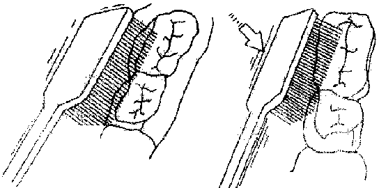 El mango del cepillo debe ser mantenido horizontal y paralelo al arco dental.