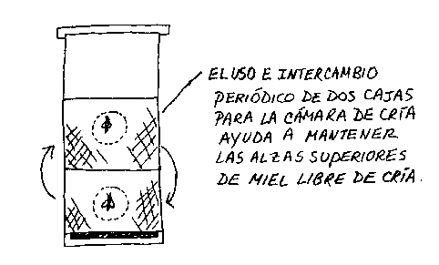 Intercambie las dos cajas de la cámara de cría periódicamente para proveer más espacio para la expansión del nido. La tendencia natural de la colonia es de aumentar el nido hacia arriba. Cuando la cada inferior contiene larva mayor y cría, operculada, y la reina está poniendo en la cada superior, cambie la posición de las dos cajas de la cámara de cría Esto coloca a la reina en la cada inferior donde puede seguir subiendo a medida que las celdas de la cada superior se van vaciando por las abejas adultas. Con este método de manejo la reina sube a la parte superior de la cámara de cría, y no a la alza de miel.