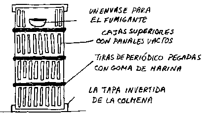 Varias cajas superiores colocadas una encima de la otra y cerradas con barro o con pedazos de periódico pegados con una pasta de harina (cualquier almidón, harina, y agua) se puede tratar con azufre o con fosfuro de aluminio