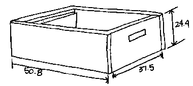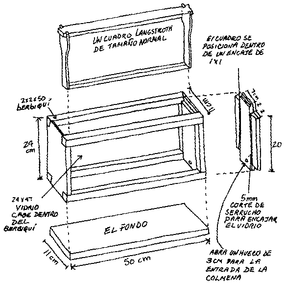 Una colmena de observación (usando madera de 1.9 cm, todas medidas en cm)