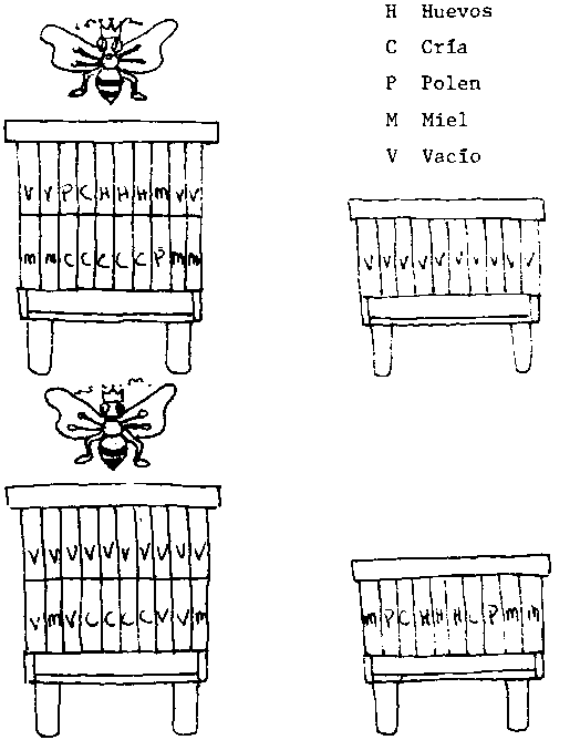 2. Utilizar equipo estéril, libre de enfermedades. De la colmena madre, remover de 5 a 6 marcos. Dejar a la reina en la colmena madre. Tres marcos con cría, con muchos huevos. Un marco sellado con cría. Dos marcos con polen. Esta nueva colmena se llama núcleo.