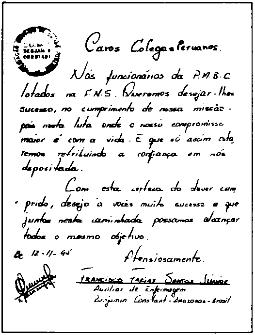 Apreciados colegas peruanos. Nosotros trabajadores (sanitarios) de la Prefectura Municipal de Benjamin Constant destacados en la Fundación Nacional de Salud (Ministerio de Salud) queremos desearles éxitos en el cumplimiento de esta misión, pues en esta lucha el compromiso mayor es con la vida ya que así estaremos retribuyendo la confianza depositada en nosotros. Con la certeza del deber cumplido deseo nuevamente a Uds. muchas felicidades y que juntos en este camino podamos avanzar hacia el mismo objetivo.