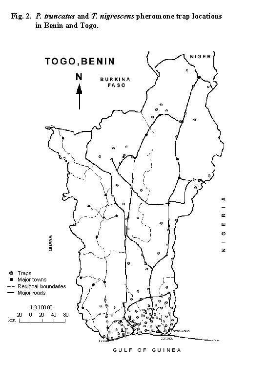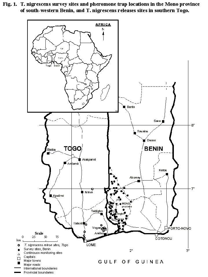 sites and pheromone trap locations in the Mono province of south-western Benin, and T. nigrescens