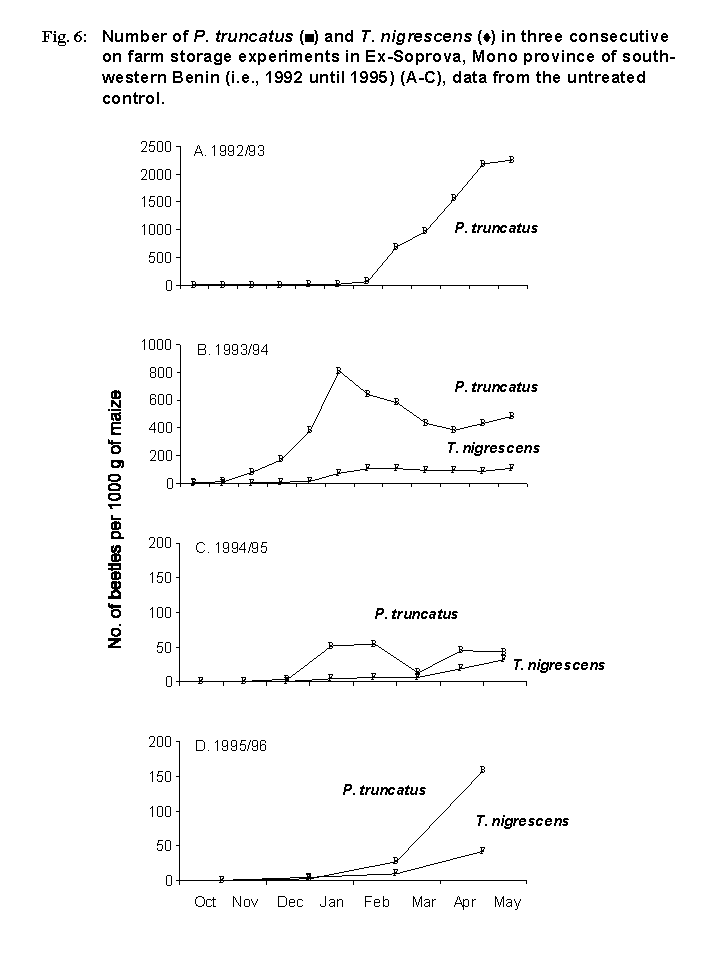 Results from the trap catches during the five surveys between 1992 and 1995 demonstrate a distinct increase of T. nigrescens accompanied by decreasing numbers of P. truncatus in the pheromone traps. Follow-up studies of the T. nigrescens releases in Kenya revealed that the numbers of P. truncatus in pheromone traps considerably decreased in the release areas, accompanied by rising trap catches of T. nigrescens (Giles et al., 1995).