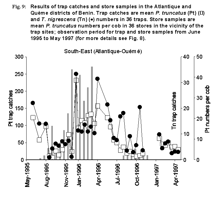 During the course of this study, trap catches of P. truncatus were decreasing in the south of Benin and Togo, accompanied by a considerable reduction in grain losses in rural maize stores. At the same time we recorded increasing numbers of T. nigrescens in the pheromone traps in these areas, indicating an establishment, spread and impact of the predator on the population dynamics of its prey. However, in certain areas, particularly in the north of Benin, pest densities were still high. Consequently, most recently a series of releases of T. nigrescens were carried out in several sites in the Borgou and Atakora province of northern Benin (IITA, unpublished data). Studies on impact assessment of the predator in these areas are ongoing.