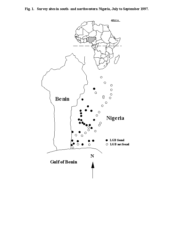 The surveys indicated that LGB has moved out of the border areas of the south-west from where it probably entered into the country to the hinter-land and spreading eastwards. It is now found in Osun and Kwara States where earlier surveys did not show its presence. It is therefore necessary to initiate practical steps towards its control and containment before it covers the entire country. Practical steps like the introduction of its known natural enemies and mass rearing leading to eventual releases should be initiated.