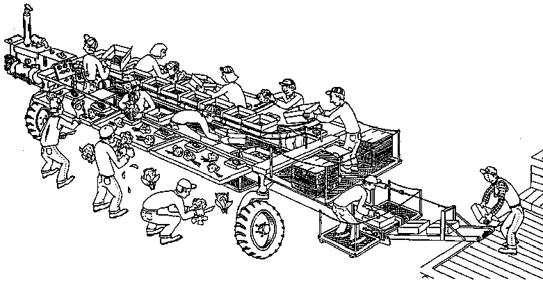 A self-propelled field pack system allows field workers to cut, trim, tie/wrap and pack in the field, thus eliminating the expense of operating a packing shed. In the illustration below, a fiat bed truck is moving along-side the field pack system, and packed produce is being loaded for transport.