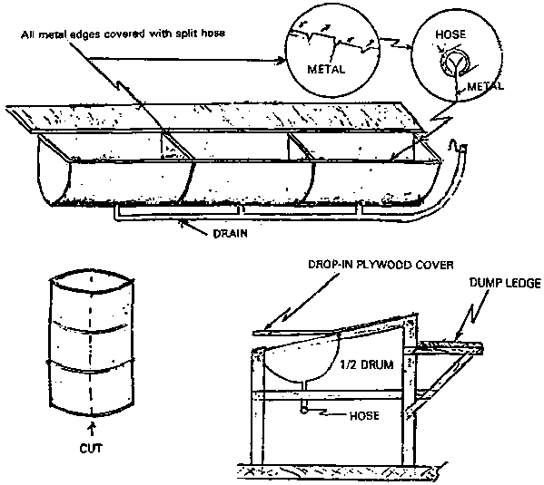 Steel drums can be used to make a simple washing stand. The drums are cut in halt fitted with drain holes and all the metal edges are covered with split rubber or plastic hose. The drums are then set into a sloped wooden table. The table top is constructed from wooden slats and is used as a drying rack before packing.