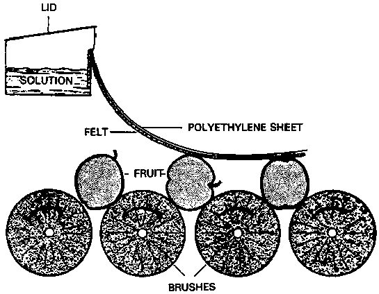 The waxing device illustrated here is designed to be used after a series of dry brushes on a conveyor line. Industrial wool felt is used to distribute the liquid wax to the fruits or vegetables from a trough made the same width as the belt. Evaporation of wax from the felt is reduced by covering the felt with a layer of heavy polyethylene sheeting.