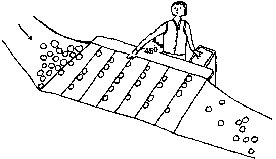 The onion sizing table illustrated below is one of three (or more) tables used in a stairway fashion. Each table is made of plywood, and has been perforated with holes of a specific size. The uppermost table has the largest size holes, and the lowest table has the smallest holes. A layer of onions is dumped onto the uppermost table. Those that do not pass through are classified as "extra-large'' in size. Those that pass through fall into a mesh bag and roll into a large container. This container of onions is dumped onto the second sizing table. The onions that do not pass through are classified as "large", and so on.