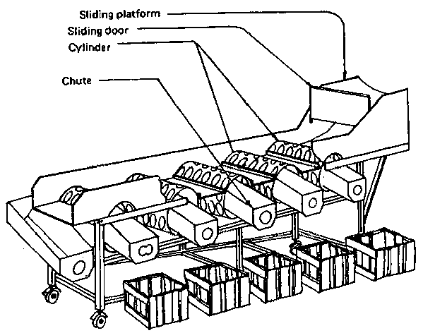 The rotary cylinder sizer illustrated below is composed of five hollow cylinders which rotate in a counterclockwise motion when driven by an electric motor. Each cylinder is perforated, with holes large enough to let fruits drop through. The first cylinder has the smallest diameter holes, and the fifth has the largest holes. When fruits fall through, they are caught on a slanted tray (the chute), and roll into the containers as shown. Take care that the distance of the drop is as short as possible to prevent bruising. Oversized fruits are accumulated at the end of the line. This equipment works best with round commodities.