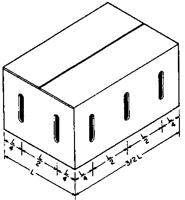 The illustration below shows the recommended pattern of vents for cartons used to hold produce that is to be forced-air cooled. Vents should make up 5% of the total surface area, and should be located 5 to 7.5 cm (2 to 3 inches) away from the corners. A few large vents (1.3 cm =0.5 inch wide or more) are better than many small vents.