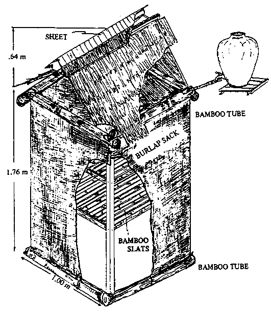 Evaporative coolers can be constructed from simple materials, such as burlap and bamboo. The "drip cooler" shown here operates solely through the process of evaporation, without the use of a fan. Cooling will be enhanced if the unit is kept shaded and used in a well ventilated area.