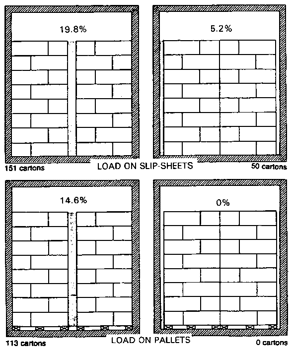 Only the load on the bottom right is fully protected from heat transfer. The use of pallets keeps the cartons off the floor, while center-loading leaves an insulating air space between the pallet loads and the outside walls.