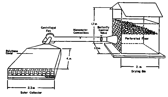 The solar drier for cassava chips illustrated below consists of a solar collector, a fan, and drying bin. The solar collector is constructed on a concrete base, using a layer of fine stones and two layers of concrete blocks, all covered with polyethylene.
