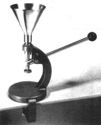 This is a hand-operated piston-type extruder for dough-like materials, and is available in many variations in Asia. It can be fabricated from metal or wood, with either a fixed or interchangeable die plate. Dimensions: 8 x 25 x 7cm.