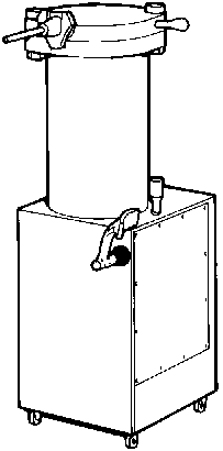 This small industrial pan is made from stainless steel and has an outlet tap at the bottom. The lid is attached by a hinge and bracket.