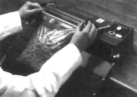 Ravioli can be made easily using this machine in the following way. Two rolled out sheets of dough, each 8.5cm wide, leave the pasta machine to feed the ravioli maker. A container for holding the stuffing is provided. The stuffing is placed manually onto the dough and covered. The process is continuous until the kneaded mixture in the hopper is exhausted. Throughput: 20kg per hour.