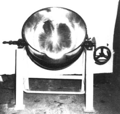 This kettle is designed for fruit processing. Two models are available: the tilting and the fixed type. In the fixed type the stirring mechanism is motorized and teflon scrapers prevent the food charring. Unloading is by an outlet at the bottom of the kettle. The inside is made of stainless steel whilst the outer casing is mild steel. Capacity: 250 litres to 500 litres.