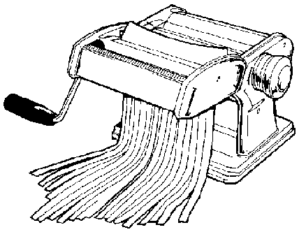 This is a hand-operated pasta machine for the household/small scale. The machine has a spaghetti head and stainless steel cutting blades, and can produce noodles up to 0.64cm wide. Recipes are included.
