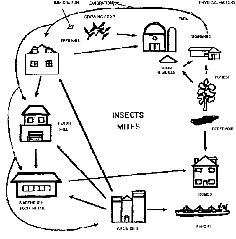 A regional ecosystem for study of stored grains showing the insect and mite holes and their movement by flight or within contaminated goods.