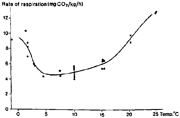 Temperature is the single most important factor affecting the rate of respiration. For biological material this can be expressed as; Q10 = 2, i.e. the rate of respiration is doubled for every 10°C increase in temperature over the range 5°C to 25°C. Significant variations to this general rule will occur through interactions with other factors affecting the rate of respiration, as discussed in the previous paragraphs.