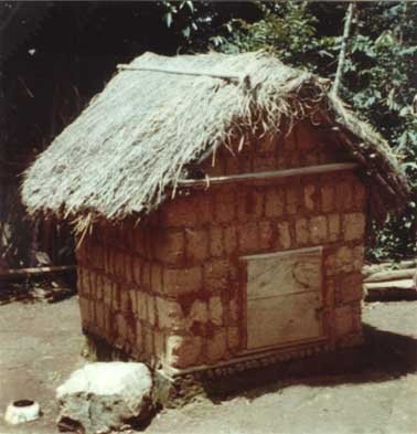 The Naturally Ventilated Store introduced by the FAO project was a mudblock structure, 1.2m long, 1.2m wide and 1.0m high to the eaves with a thatched roof and a capacity of about 700kg The capacity could be increased by making the store longer. (Figure 4.10). The lower part of the store was a ventilating chamber or plenum made over a pit about 35cm deep into which was built a stone foundation wall 15 cm deep to support a mud block wall on the periphery of the pit and rising to ground level. Wooden sticks (saplings or sawn timber) were spaced two or three centimetres apart and laid over the stone wall to make a ventilating floor. A mudblock wall was continued upwards for a further one metre to the eaves. On the windward side of the structure a ventilation opening was fitted with a shutter to control ventilation. The storage section was from the false floor up to eaves at one metre high and was provided with closeable openings for loading and emptying. The roof was a structure of raffia (or equivalent wood material) covered with grass.