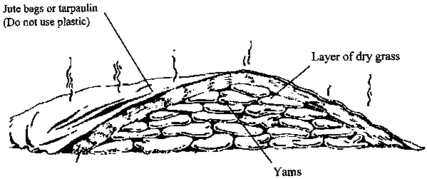 · Above ground. Yams are carefully piled on the ground and covered by a layer of grass at least 15 cm thick and finally a canvas tarpaulin or jute bags are used to cover the whole pile (Figure 4.1). Plastic sheets should not be used and the curing pile should not be exposed to direct sunlight. The cover should be removed after 4 days (Knoth, 1993).· Pit-curing. This is a widely used system in parts of Nigeria. It consists of a pit, approximately 2.5 x 1.5 x 1 metre with the bottom lined with sawdust or dry grass. The yam tubers are placed on this lining and then covered with a thin layer of soil. The treatment takes about two weeks after which the tubers can be removed for storage. According to trials in Nigeria, yam tubers treated for two weeks by this method showed only 40% rotted tubers after 4 months of storage, compared to 100% of untreated tubers. This method may need further studies in order to define more precisely the parameters of the operation, particularly in considering the optimum duration of the curing period combined with an appropriate fungicide.