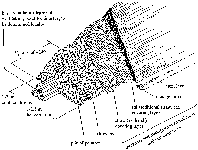 The clamp is a simple and inexpensive storage method particularly applicable to the more temperate regions of Europe and Latin America (Figure 4.9). The details of design vary considerably but all follow similar lines. CIP recommends (Centro International de Papa 1981) that tubers are heaped on a bed of straw 1m to 1.5m wide with a ventilating duct on the floor in the centre of the heap and covered with a layer of about 20 cm of compacted straw or 30 cm if not compacted. The clamp must be in a well-drained location. Temperatures inside a ventilated clamp will be approximately those of the ambient temperatures.