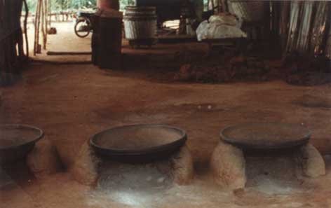 A traditional fireplace consists of three large stones supporting the frying pan. This causes a great deal of discomfort to the operators due to exposure to heat and smoke from the fire and steam from the wet cassava mash. At the same time the system is very inefficient in its use of fuel, energy consumption per unit of dried gari is considered to be very high. Even enclosing the fire on three sides will improve fuel consumption and reduce the smoke blowing into the faces of the operator. The inefficiency of frying and firewood consumption are the most important issues in traditional gari production that need to be addressed most urgently.