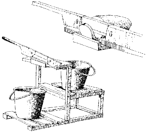 In larger scale operations pressing takes place after fermentation. The grated mash is left to ferment for one to four days in its container. Pressing is done using one of a number of designs of screw or hydraulic press which need access to simple workshops for their construction (Figure 5.7 a and b). The Technology Consultancy Centre in Ghana developed a parallel board press in which a pulp filled bag is placed between two parallel boards which are screwed together to apply pressure to the bag. This idea has been extended to a screw press which can take several bags, but its construction requires heavy metal components. Some authorities consider it will normally take 20-30 minutes for the grated mash to reach the required level of 45%-50% moisture content (Muchnik and Vinck 1984, Flach 1990, Bencini, 1991), but others suggest that in the larger presses it may take three to four hours (ITGD 1993).