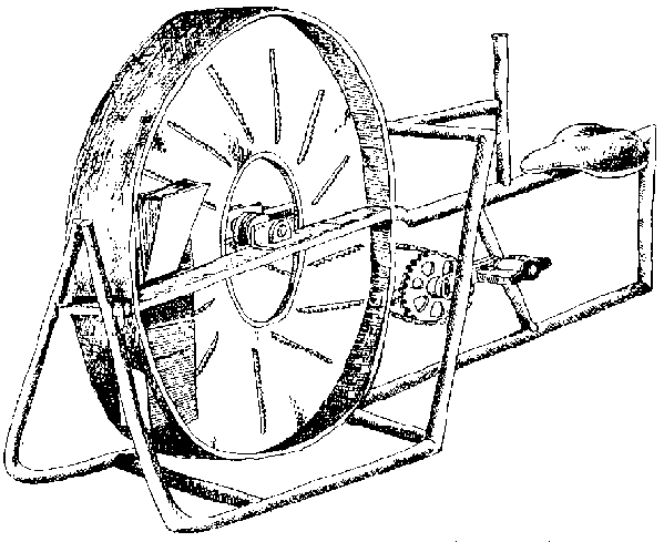 A number of small mechanical cutting machines have been developed to improve chipping. The Department of Agricultural Chemistry and Food Science in the Philippines3 has designed a simple slicer which is said to cut sweet potatoes much faster and of a more consistent thickness than manual methods and is claimed to be equally successful with cassava. The roots are held on a cutting platform against a plate which controls the thickness of the slice. Slices are then cut off with the pivoting blade (Figure 5.1). Other designs include a metal blade mounted in a framework or a metal disc which incorporates a cutting blade, both types being rotated by hand or powered by peddling a bicycle type mechanism. Figure 5.2 illustrates a hand operated cutter developed by CIP. The root is pressed down against the disc with one hand whilst the other hand turns the handle and rotates the disc. P.T. Kerta Laksana of Indonesia4 has made a pedal-driven sliced fitted with one large slicing blade which is claimed to have a capacity of up to 500 Kg per hour. All these machines produce thinner and more uniform slices than chipping by hand.